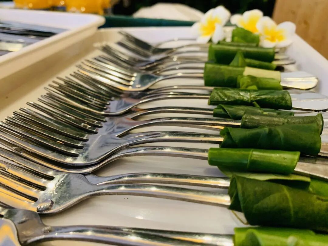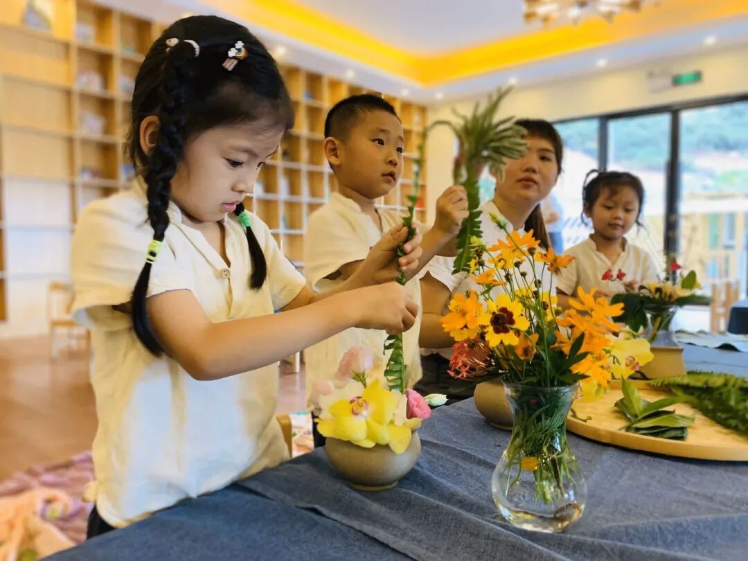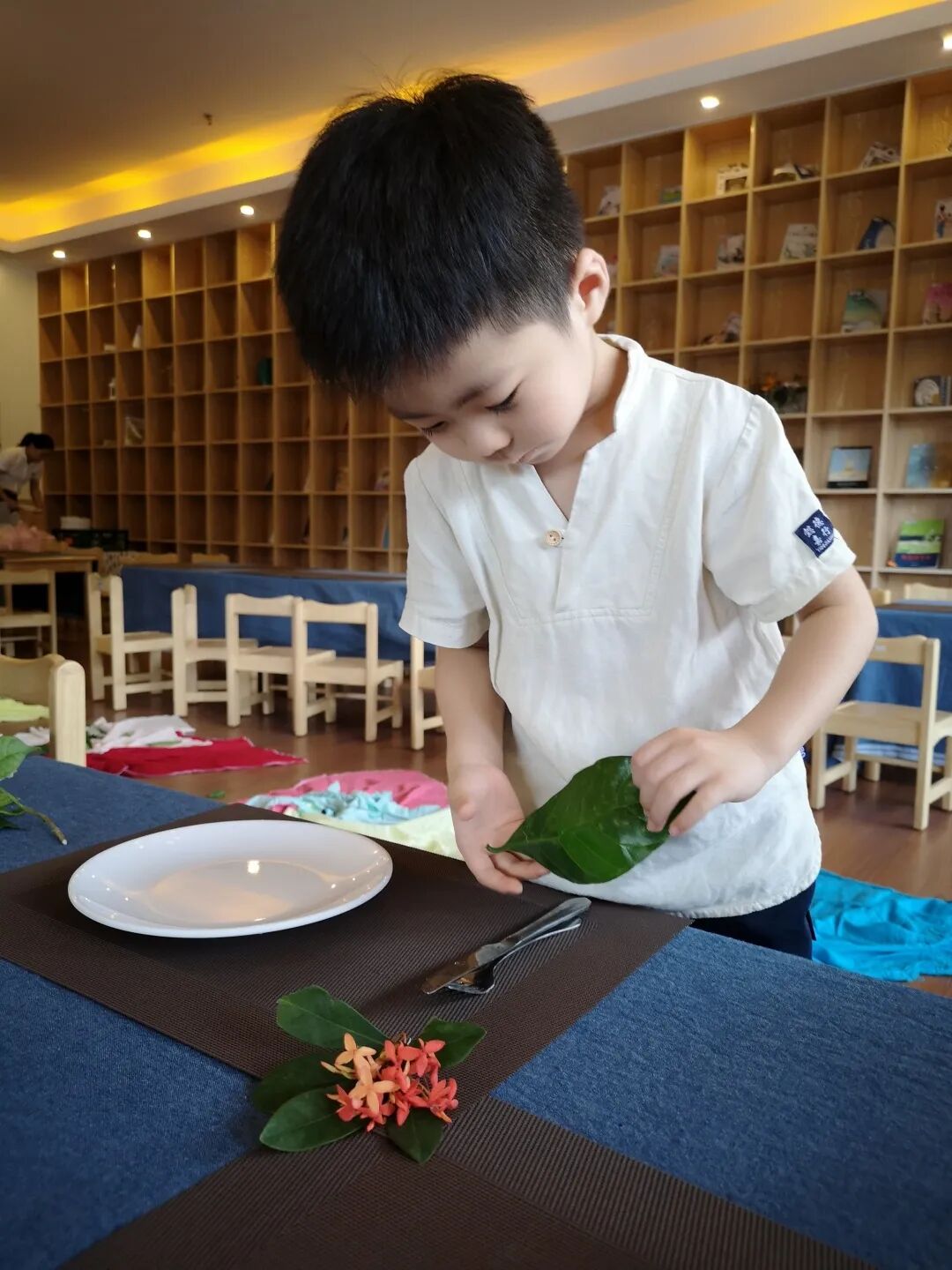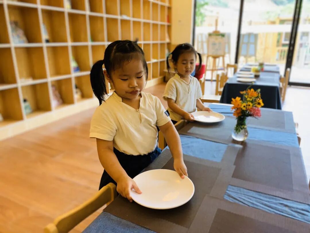 铺上整齐的桌布、摆放餐垫和刀叉、插上鲜花,经过孩子们的一番精心布置,优雅的西餐厅呈现在了孩子们面前。
